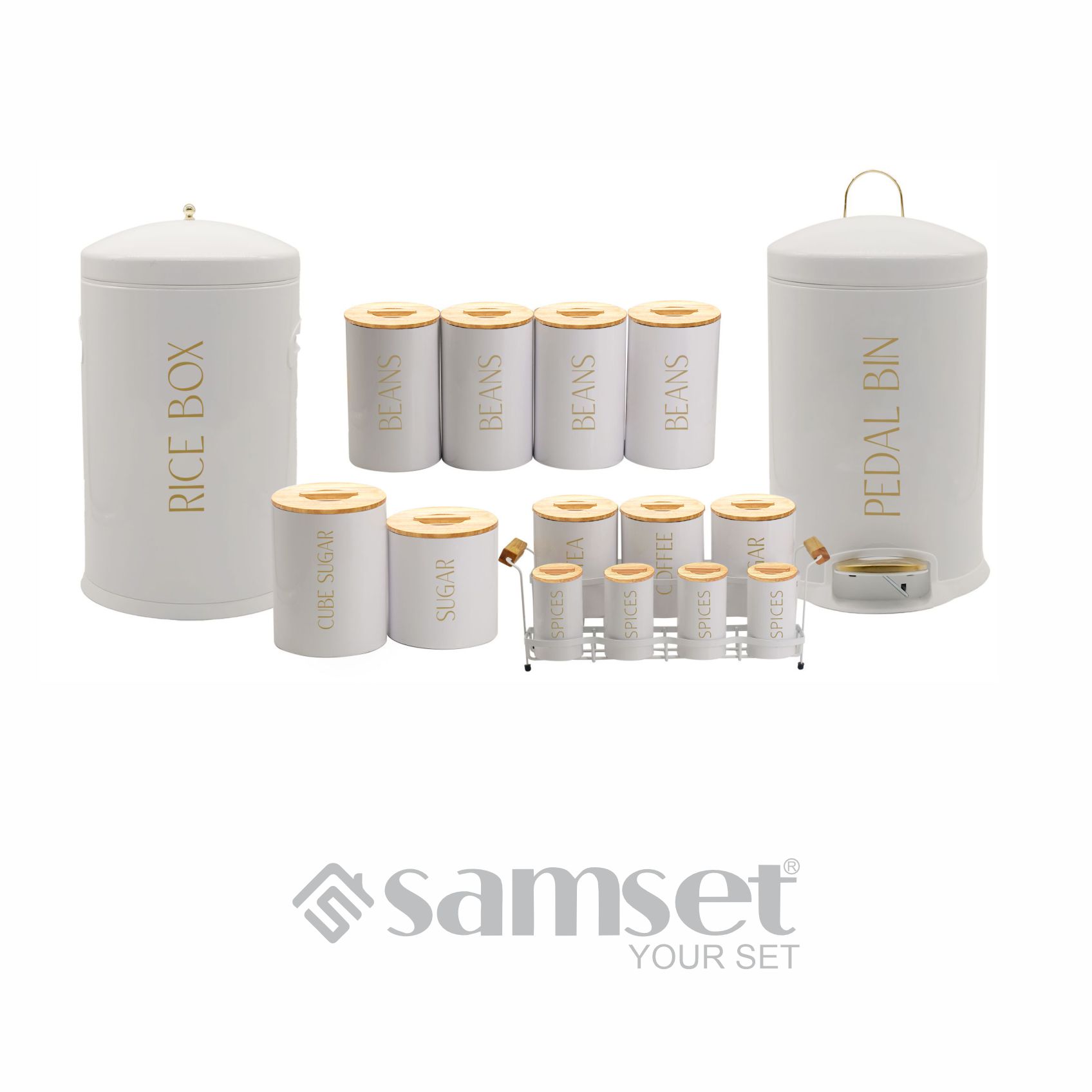 این سرویس شامل استند ۸ پارچه پاسماوری برای نگهداری ادویهها، ۴ عدد قوطی حبوبات جهت حفظ تازگی مواد غذایی، ظرف قند و ظرف شکر با درب چوبی زیبا، سطل زباله پدالی برای حفظ نظافت، و سطل برنج با ظرفیت مناسب است. تمامی این اقلام با هماهنگی کامل طراحی شدهاند تا علاوه بر نظمدهی به آشپزخانه، جذابیت بصری فوقالعادهای ایجاد کنند.